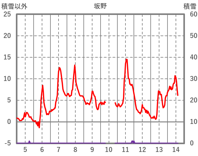 | 日 | 時 | 気温 | 降水 | 風向/風速 | 日照 | 積雪 | 降雪 |