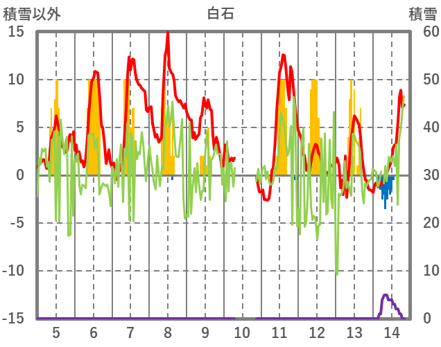 | 日 | 時 | 気温 | 降水 | 風向/風速 | 日照 | 積雪 | 降雪 |