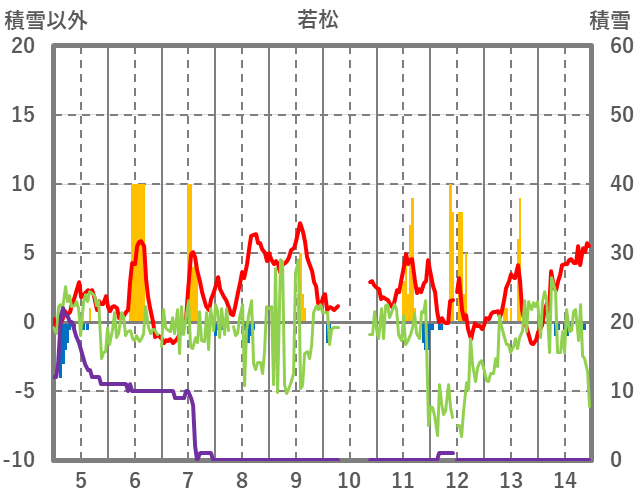 | 日 | 時 | 気温 | 降水 | 風向/風速 | 日照 | 積雪 | 降雪 |