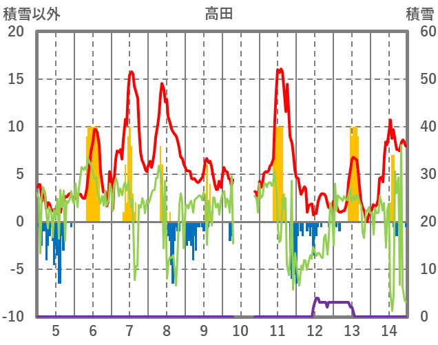 | 日 | 時 | 気温 | 降水 | 風向/風速 | 日照 | 積雪 | 降雪 |