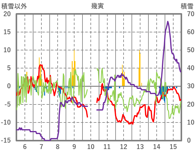 | 日 | 時 | 気温 | 降水 | 風向/風速 | 日照 | 積雪 | 降雪 |