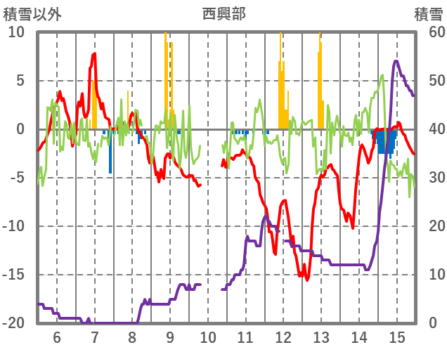 | 日 | 時 | 気温 | 降水 | 風向/風速 | 日照 | 積雪 | 降雪 |