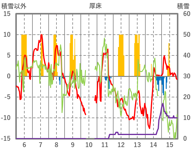 | 日 | 時 | 気温 | 降水 | 風向/風速 | 日照 | 積雪 | 降雪 |