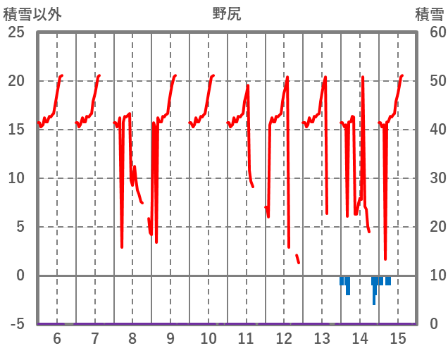 | 日 | 時 | 気温 | 降水 | 風向/風速 | 日照 | 積雪 | 降雪 |
