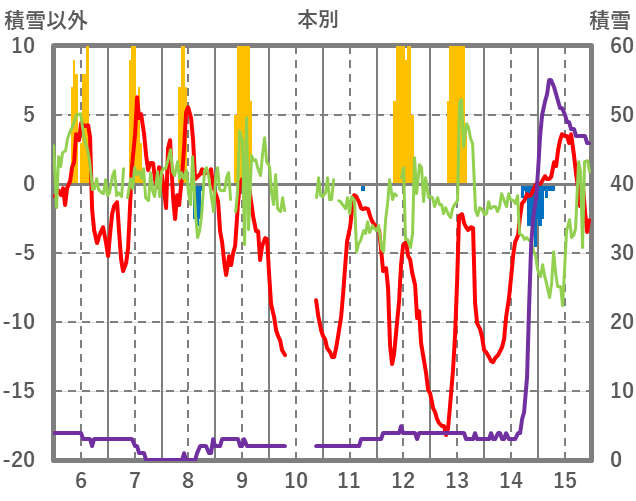| 日 | 時 | 気温 | 降水 | 風向/風速 | 日照 | 積雪 | 降雪 |