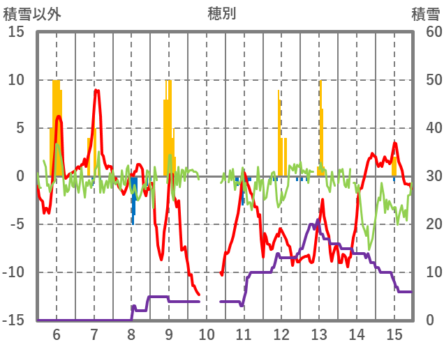 | 日 | 時 | 気温 | 降水 | 風向/風速 | 日照 | 積雪 | 降雪 |