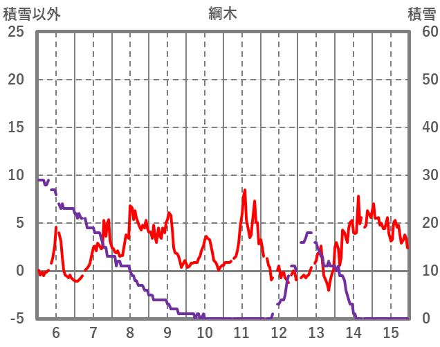 | 日 | 時 | 気温 | 降水 | 風向/風速 | 日照 | 積雪 | 降雪 |