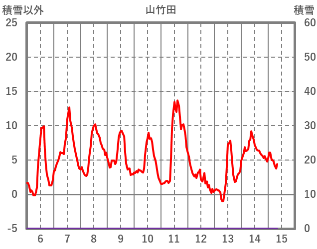 | 日 | 時 | 気温 | 降水 | 風向/風速 | 日照 | 積雪 | 降雪 |