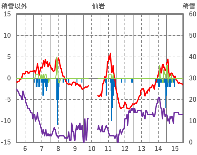| 日 | 時 | 気温 | 降水 | 風向/風速 | 日照 | 積雪 | 降雪 |