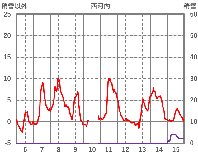 | 日 | 時 | 気温 | 降水 | 風向/風速 | 日照 | 積雪 | 降雪 |