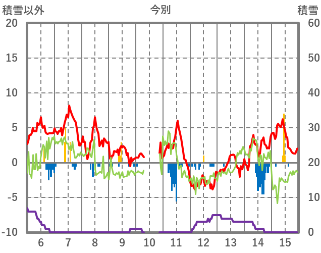 | 日 | 時 | 気温 | 降水 | 風向/風速 | 日照 | 積雪 | 降雪 |