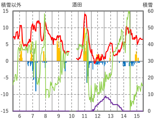 | 日 | 時 | 気温 | 降水 | 風向/風速 | 日照 | 積雪 | 降雪 |