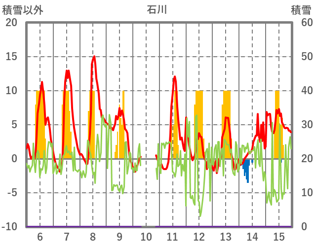 | 日 | 時 | 気温 | 降水 | 風向/風速 | 日照 | 積雪 | 降雪 |