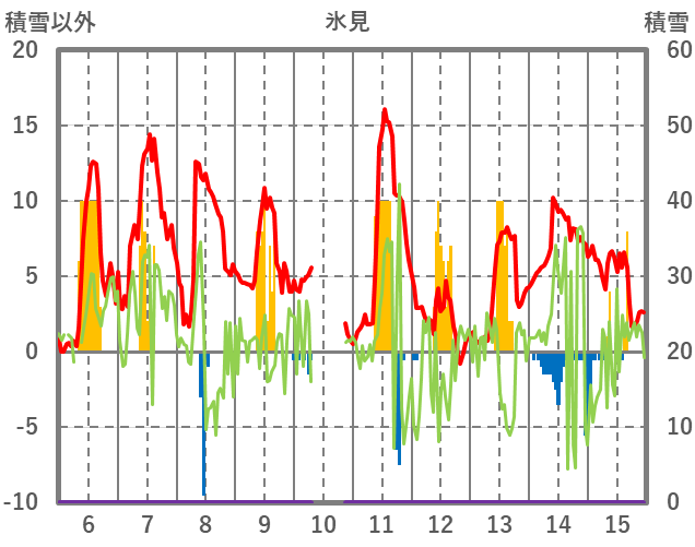 | 日 | 時 | 気温 | 降水 | 風向/風速 | 日照 | 積雪 | 降雪 |