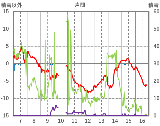 | 日 | 時 | 気温 | 降水 | 風向/風速 | 日照 | 積雪 | 降雪 |