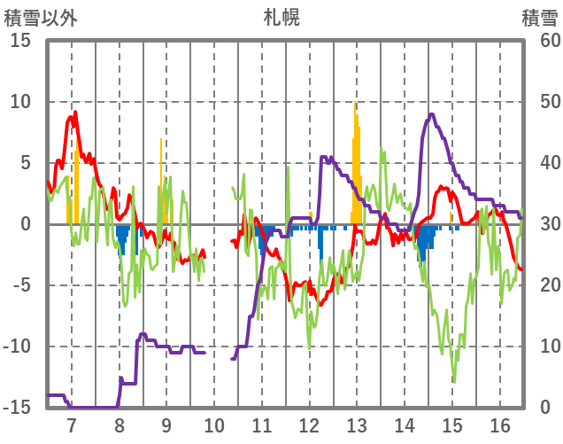 | 日 | 時 | 気温 | 降水 | 風向/風速 | 日照 | 積雪 | 降雪 |