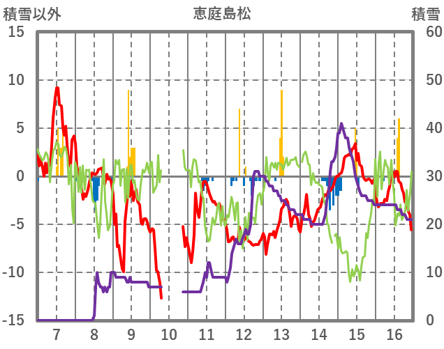 | 日 | 時 | 気温 | 降水 | 風向/風速 | 日照 | 積雪 | 降雪 |