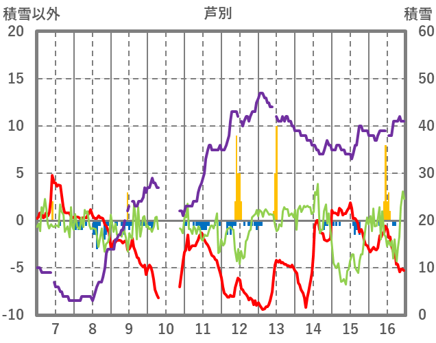 | 日 | 時 | 気温 | 降水 | 風向/風速 | 日照 | 積雪 | 降雪 |