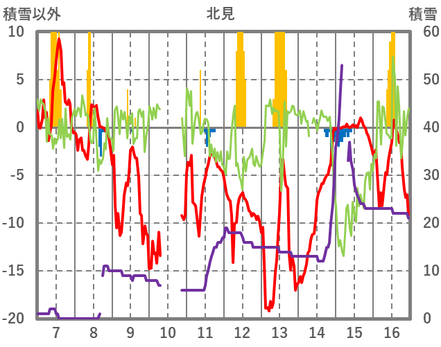 | 日 | 時 | 気温 | 降水 | 風向/風速 | 日照 | 積雪 | 降雪 |