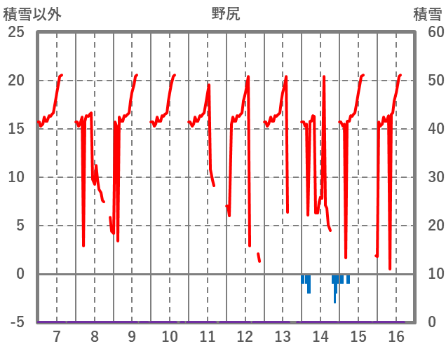 | 日 | 時 | 気温 | 降水 | 風向/風速 | 日照 | 積雪 | 降雪 |