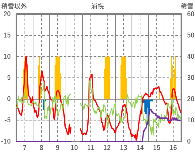 | 日 | 時 | 気温 | 降水 | 風向/風速 | 日照 | 積雪 | 降雪 |