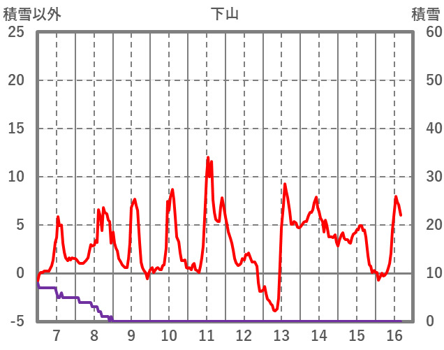 | 日 | 時 | 気温 | 降水 | 風向/風速 | 日照 | 積雪 | 降雪 |