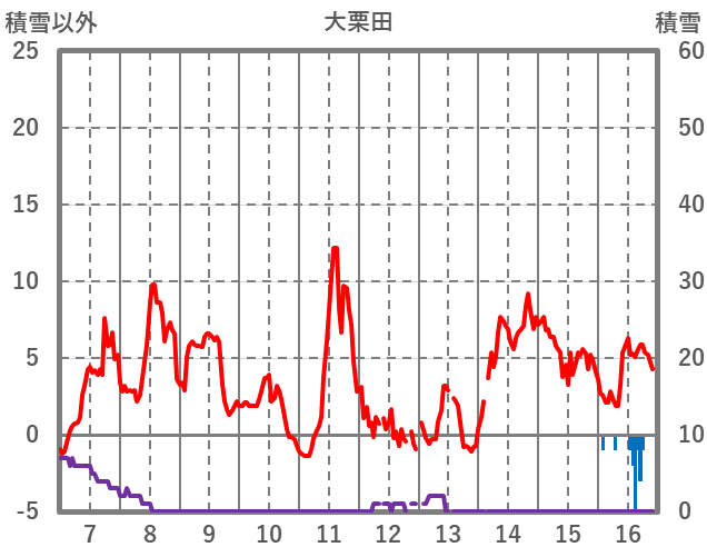 | 日 | 時 | 気温 | 降水 | 風向/風速 | 日照 | 積雪 | 降雪 |