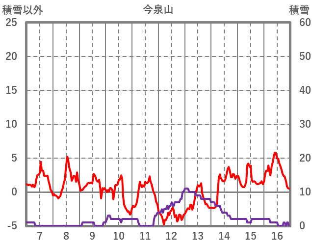 | 日 | 時 | 気温 | 降水 | 風向/風速 | 日照 | 積雪 | 降雪 |