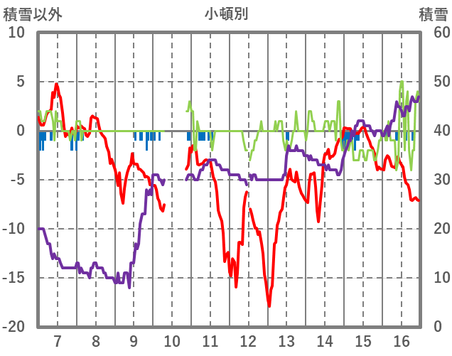 | 日 | 時 | 気温 | 降水 | 風向/風速 | 日照 | 積雪 | 降雪 |