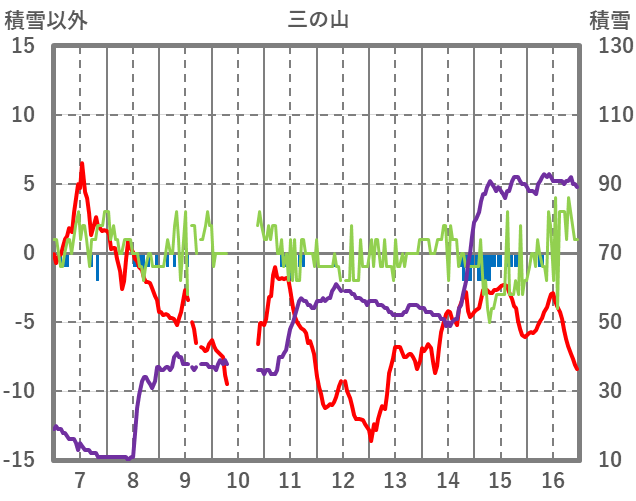 | 日 | 時 | 気温 | 降水 | 風向/風速 | 日照 | 積雪 | 降雪 |