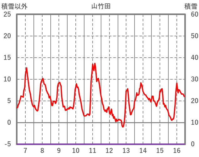 | 日 | 時 | 気温 | 降水 | 風向/風速 | 日照 | 積雪 | 降雪 |