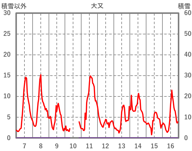 | 日 | 時 | 気温 | 降水 | 風向/風速 | 日照 | 積雪 | 降雪 |
