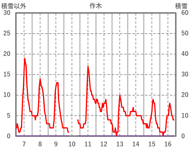 | 日 | 時 | 気温 | 降水 | 風向/風速 | 日照 | 積雪 | 降雪 |