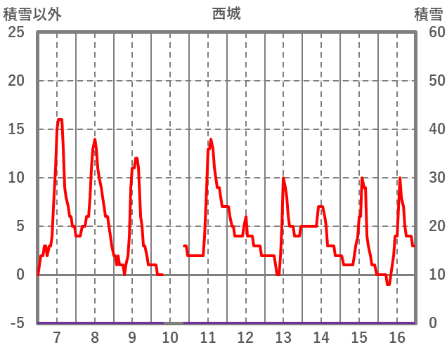 | 日 | 時 | 気温 | 降水 | 風向/風速 | 日照 | 積雪 | 降雪 |
