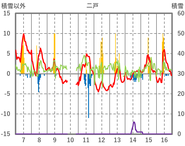 | 日 | 時 | 気温 | 降水 | 風向/風速 | 日照 | 積雪 | 降雪 |