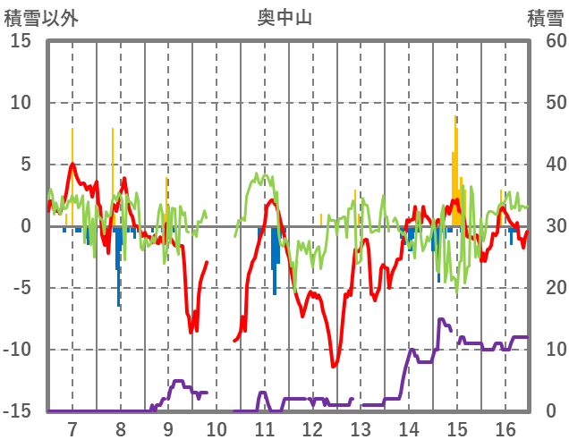 | 日 | 時 | 気温 | 降水 | 風向/風速 | 日照 | 積雪 | 降雪 |