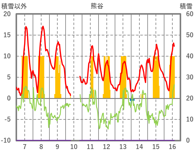 | 日 | 時 | 気温 | 降水 | 風向/風速 | 日照 | 積雪 | 降雪 |