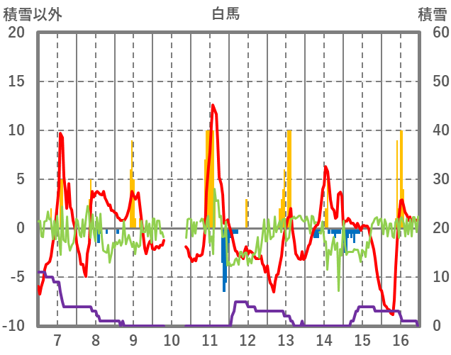 | 日 | 時 | 気温 | 降水 | 風向/風速 | 日照 | 積雪 | 降雪 |