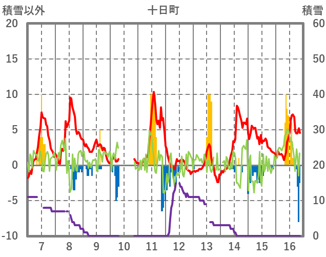 | 日 | 時 | 気温 | 降水 | 風向/風速 | 日照 | 積雪 | 降雪 |
