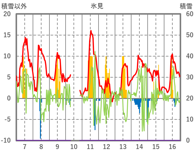 | 日 | 時 | 気温 | 降水 | 風向/風速 | 日照 | 積雪 | 降雪 |