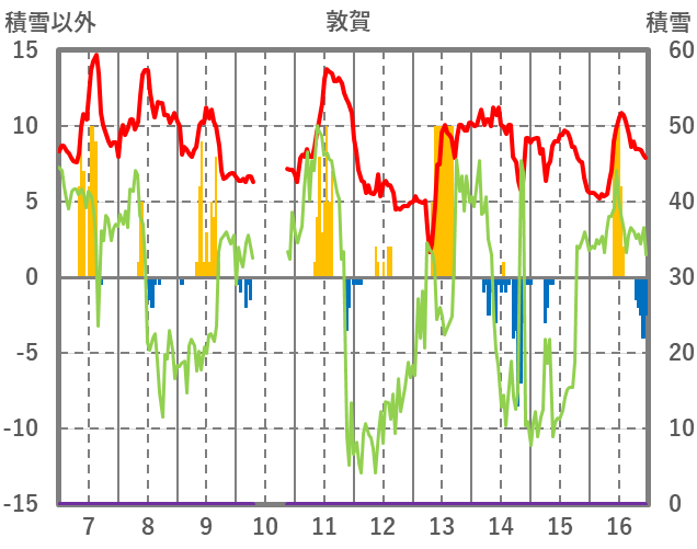 | 日 | 時 | 気温 | 降水 | 風向/風速 | 日照 | 積雪 | 降雪 |