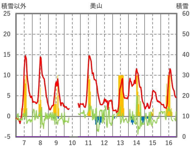 | 日 | 時 | 気温 | 降水 | 風向/風速 | 日照 | 積雪 | 降雪 |