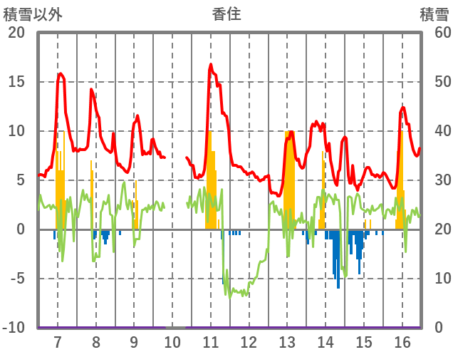 | 日 | 時 | 気温 | 降水 | 風向/風速 | 日照 | 積雪 | 降雪 |