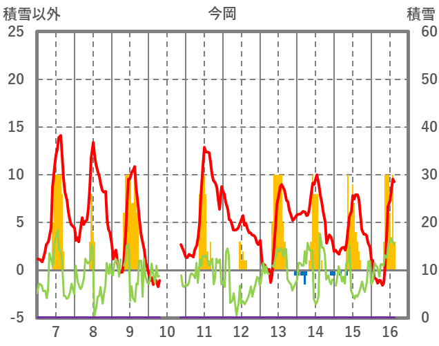 | 日 | 時 | 気温 | 降水 | 風向/風速 | 日照 | 積雪 | 降雪 |