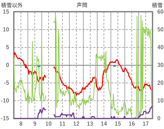 | 日 | 時 | 気温 | 降水 | 風向/風速 | 日照 | 積雪 | 降雪 |