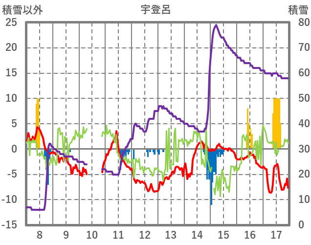 | 日 | 時 | 気温 | 降水 | 風向/風速 | 日照 | 積雪 | 降雪 |