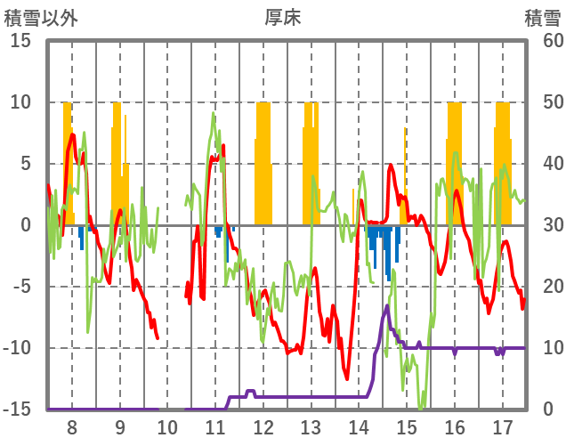 | 日 | 時 | 気温 | 降水 | 風向/風速 | 日照 | 積雪 | 降雪 |