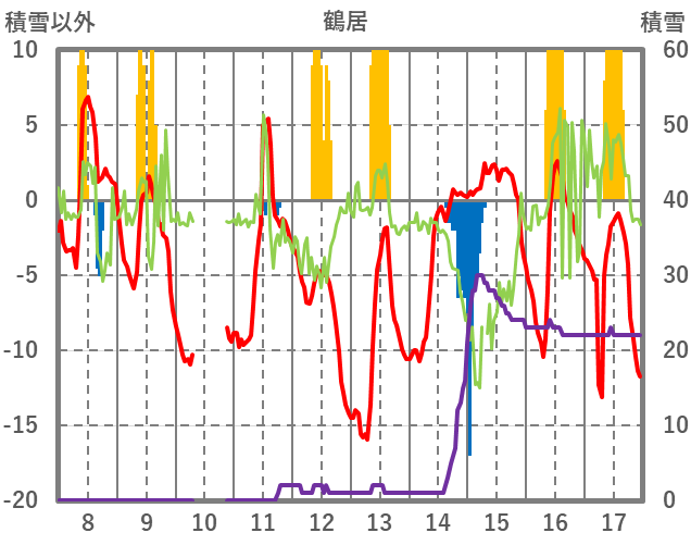 | 日 | 時 | 気温 | 降水 | 風向/風速 | 日照 | 積雪 | 降雪 |