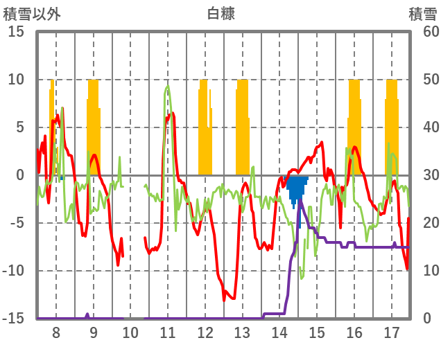 | 日 | 時 | 気温 | 降水 | 風向/風速 | 日照 | 積雪 | 降雪 |