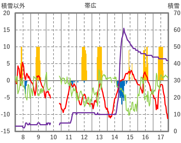 | 日 | 時 | 気温 | 降水 | 風向/風速 | 日照 | 積雪 | 降雪 |